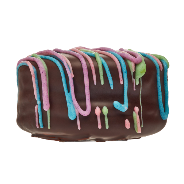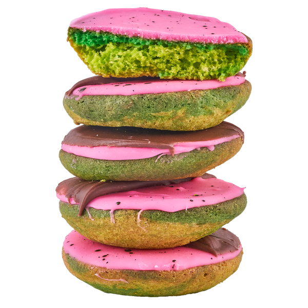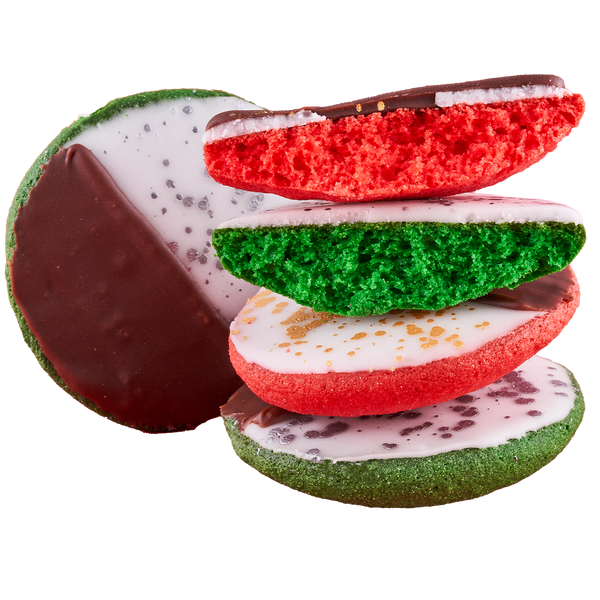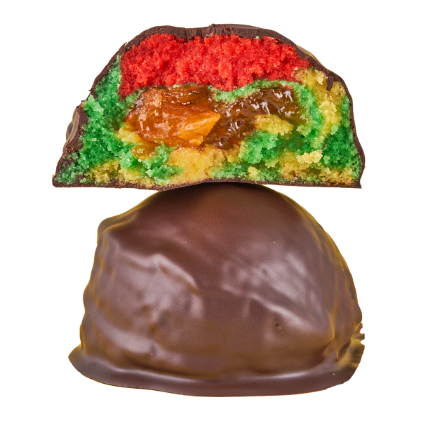 The Italian Rainbow Cookie got a major makeover. Our classic colorful rainbow almond cookie stuffed with apricot jam and covered in dark chocolate.