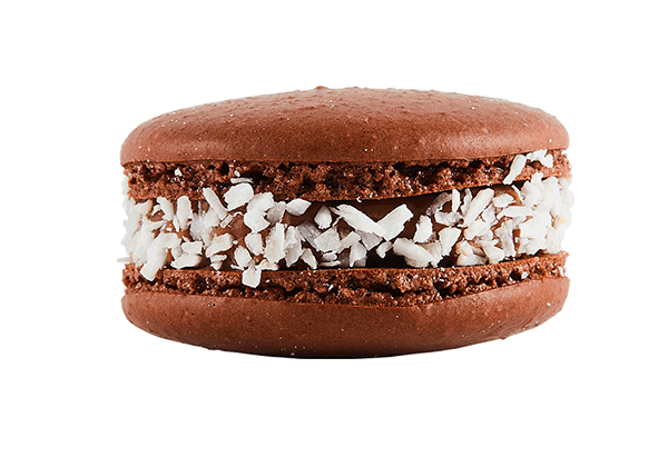 You're gonna want Samoa this. A coconut infused shortbread cookie with semi sweet chips and caramel bits stuffed with a chocolate toasted coconut caramel macaron.
