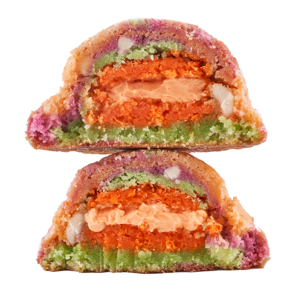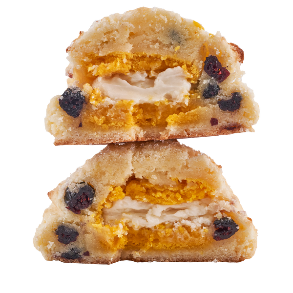 A take on a dreamy orange creamsicle inspired by the one and only Orange Blossom! This cookie is orange and vanilla infused with candied orange peels, and stuffed with vanilla custard. Pair it with a berry best friend like Orange Blossom for the most fruitastic flavor explosion.