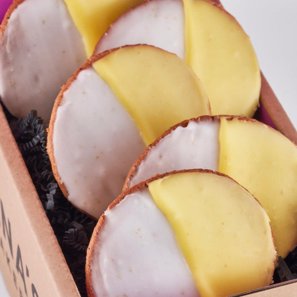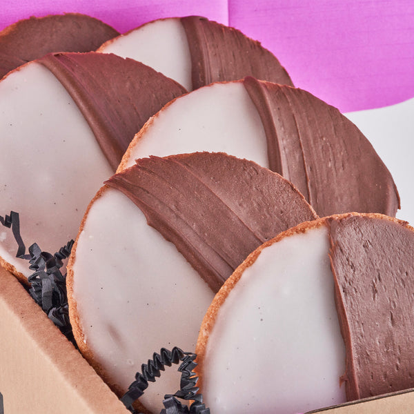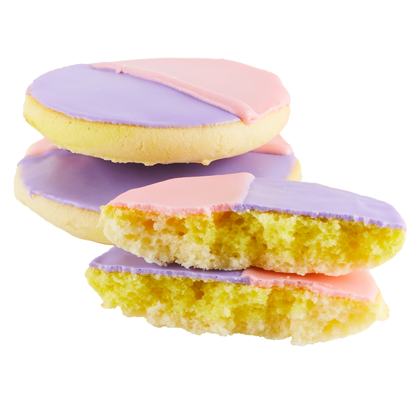 Our Classic Black & White Cookie, Easter Edition! Pink & Purple icing top these gluten-free cookies - a fun take on a classic half-moon.