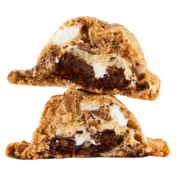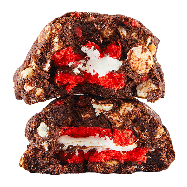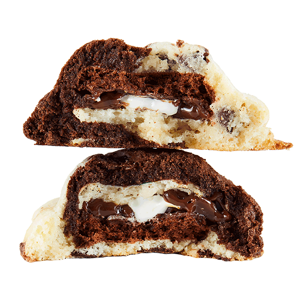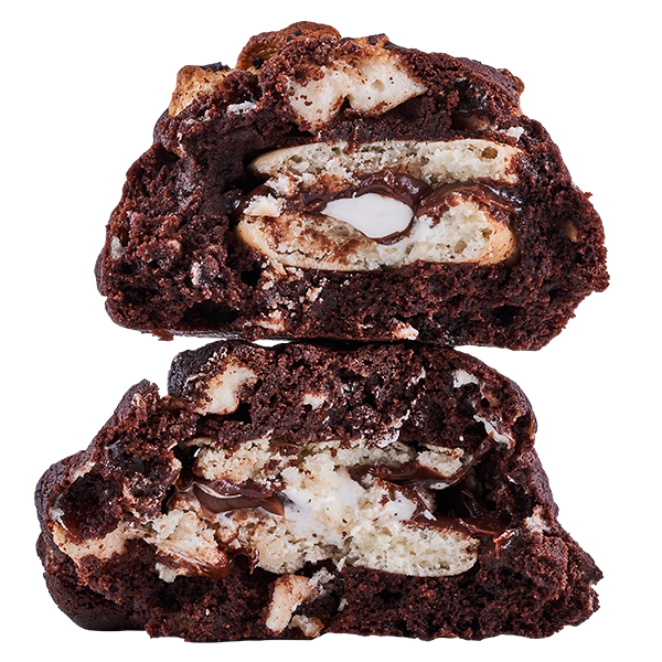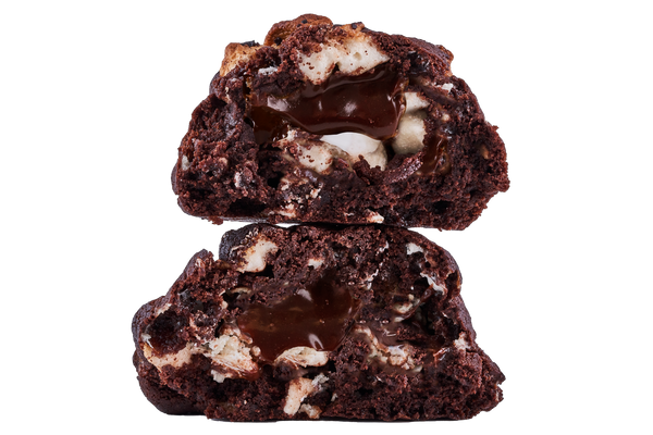 A dark chocolate cookie with marshmallows and milk chocolate chips stuffed with a chocolate fudge and marshmallow fluff!