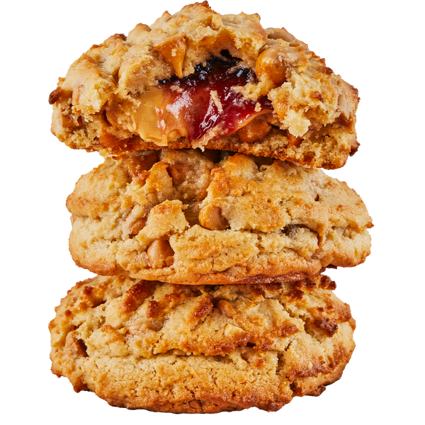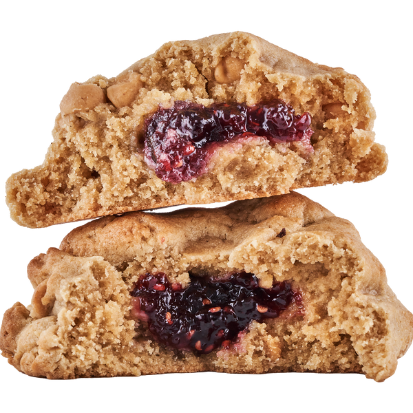 A crisp peanut butter cookie stuffed full of peanut butter chips, peanut butter and raspberry jelly.