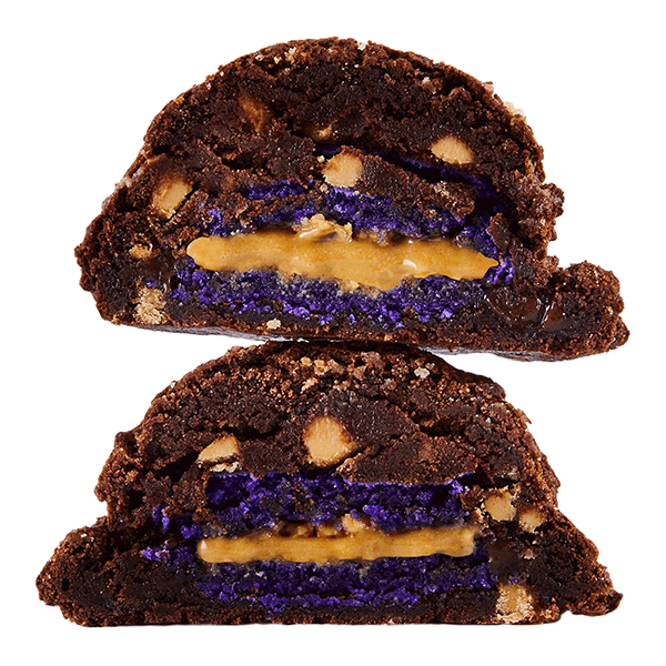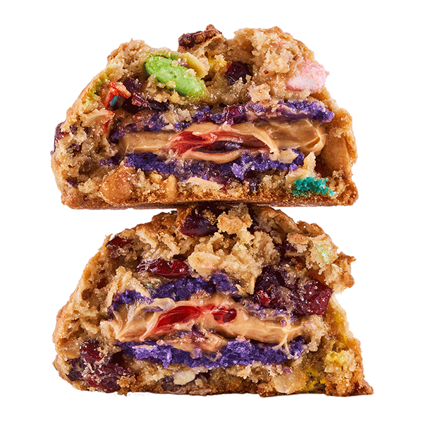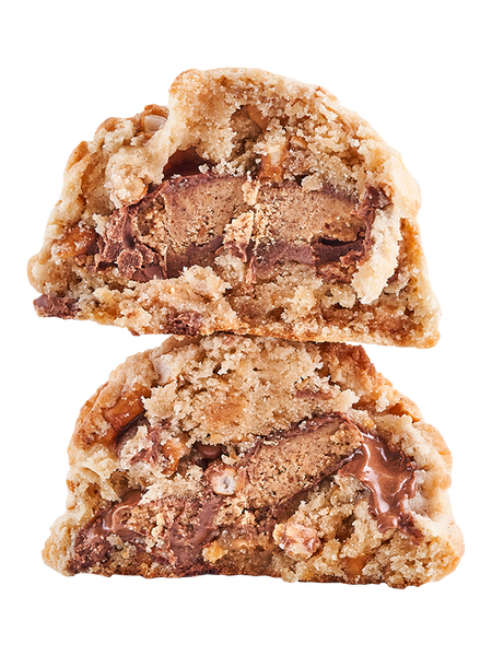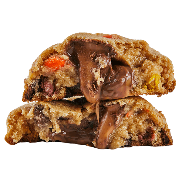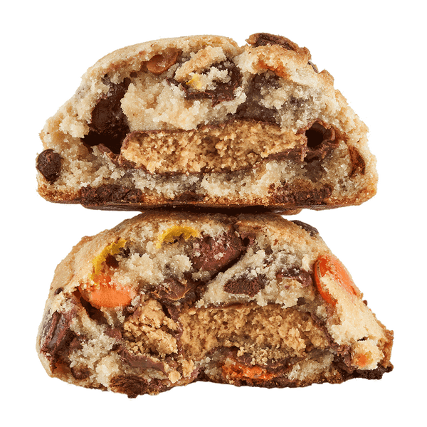 Our Peanut Butter Candy Cookie is stuffed with a Reeses Cup, Goobers, Reeses Pieces, milk and dark chocolate chips.