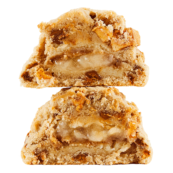 An apple cider cookie with chunks of dried apple and cinnamon chips stuffed with an apple pie macaron and dusted in cinnamon sugar.