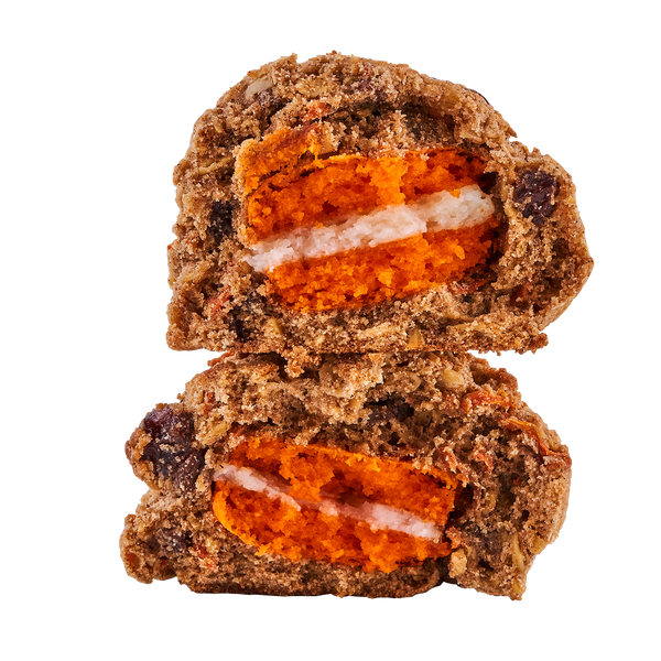 A spiced cookie loaded with freshly shredded carrots with a cream cheese macaron center.