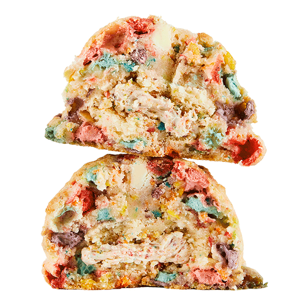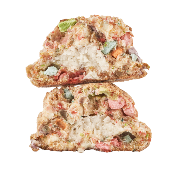 A fruity cereal and lucky marshmallow cookie, stuffed creamy cereal milk filling. Your childhood favorites magically transformed into a soft, and chewy cookie!