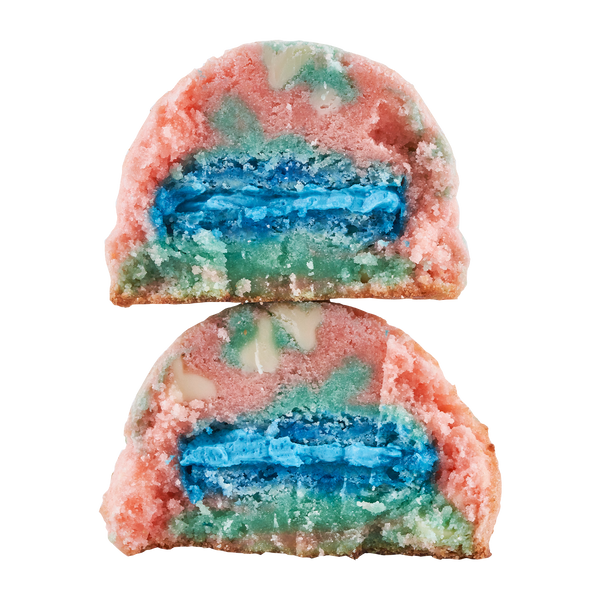 Our cotton candy macaron baked inside a pink and blue cotton candy sugar cookie. Sweet but not as sticky...let the nostalgia of boardwalks, carnivals, and state fairs take over with our Cotton Candy Mookie™!