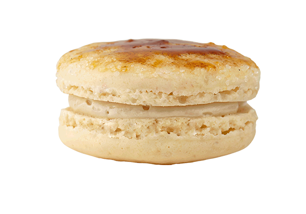 Creme Brulee is a white shell with brulee sugar on top and a caramel infused buttercream filling with pieces of caramel in it.