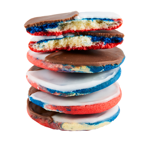 Limited edition cookies inspired by Independence Day & classic half-moon cookies. These gorgeous red white and blue tie dye cookies are coated in a delicious fudge. These cookies are nut-free and as always, gluten-free.
