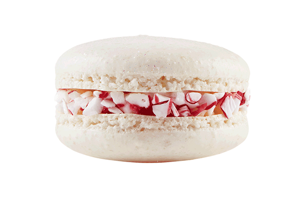 White Chocolate Winter Wonderland Macaron covered in Peppermint Candy Cane crumble.