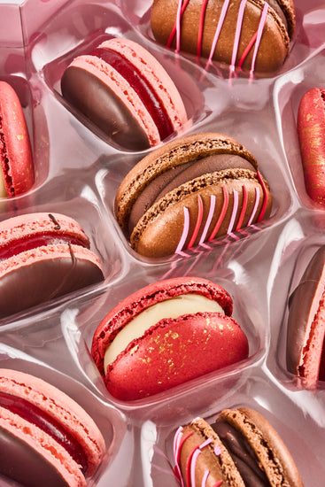Our take on the classic heart box of chocolates! This special 12-count heart-shaped macaron box features three brand-new flavor options.
